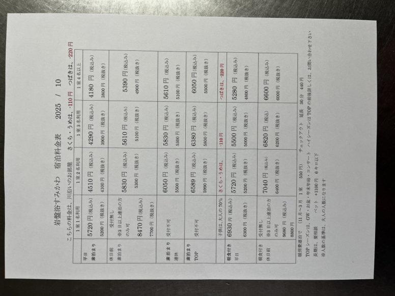 宿泊料金表